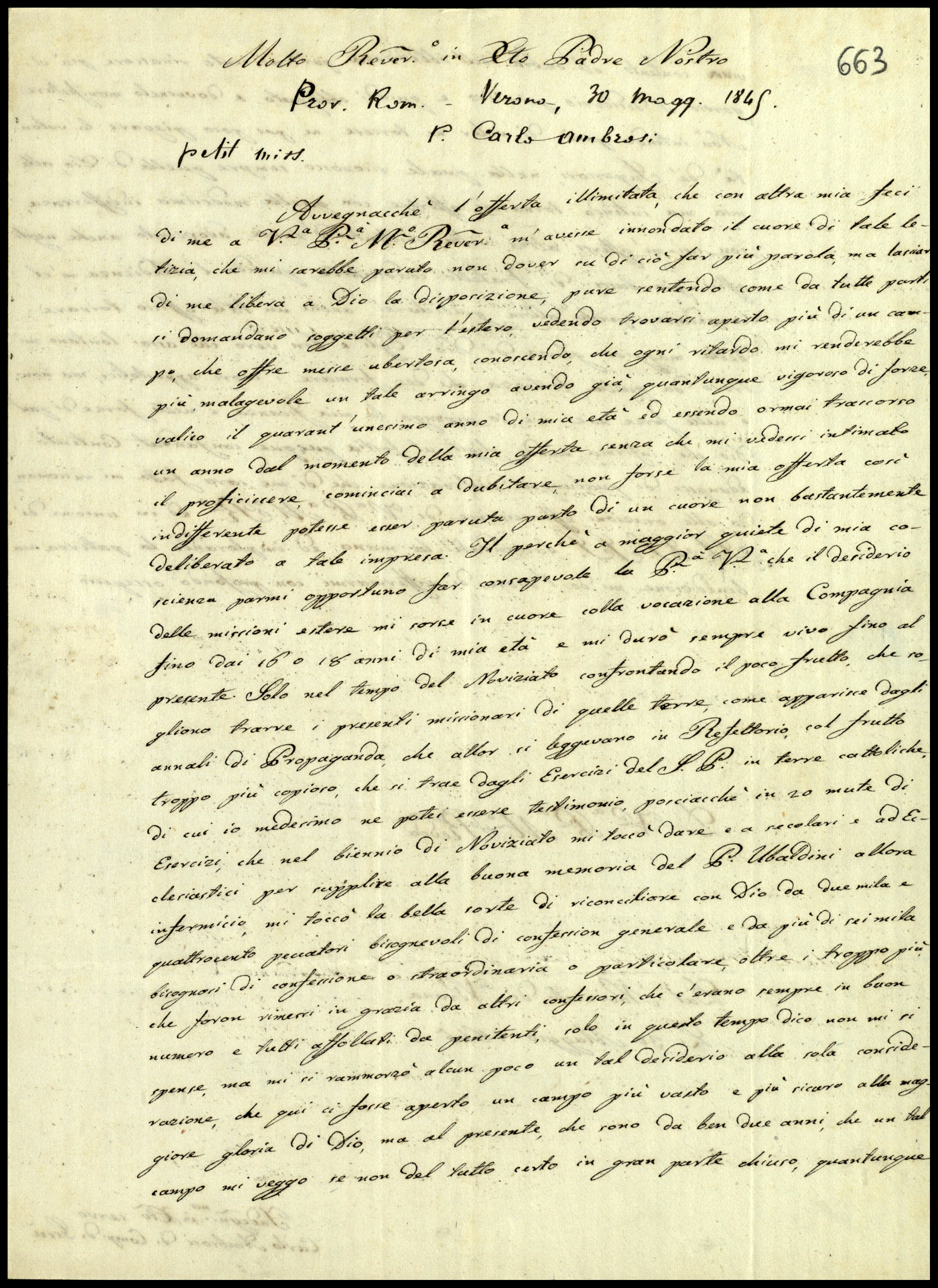 Avvegnacchè l’offerta illimitata, che con altra mia feci di me a Vostro Paternità Molto Reverenda m’avesse innondato il core di tale letizia, che mi sarebbe paruto non dover in di ciò far già parola, ma lasciar di me libera a Dio la disposizione, pure sentendo come da tutte posti domandarono soggetti per l’estero, vedendo trovarsi aperto più di un campo, che offre messe ubertosa, conoscendo, che ogni ritardo mi renderebbe più malagevole un tale arringo avendo già, qualunque vigoroso di forze, valico il quarant’unesimo anno di mia età ed essendo ormai trascorso un anno dal momento della mia offerta senza che mi vedessi intimato il proficiscere, cominciai a dubitare, non forse la mia offerta così indifferente potesse esser paruta parto di un cuore non bastantemente deliberato a tale impresa. Il perché a maggior quieta di mia coscienza parmi opportuno far consapevole la Paternità Vostra che il desiderio delle missioni estere mi sorse in cuore colla vocazione alla Compagnia fino dai 16 o 18 anni di mia età e mi durò sempre vivo fino al presente. Solo nel tempo del Noviziato confrontando il poro frutto, che sogliono trarre i precedenti missionari di quelle terre, come apparisce dagli annali di propaganda che allo si leggevano in Refettorio, col frutto troppo più copioso, che si trae dagli Esercizi del Santo Padre in terre cattoliche, di cui io medesimo ne potei essere testimonio, porciacchè in 20 mute di Esercizi, che nel biennio di Noviziato mi tocco dare e a secolari e ad Ecclesiastici per supplire alla buona memoria del Padre Ubaldini allora infermiccio, mi toccò la bella sorte di riconciliare con Dio da due mila e quattrocento peccatori bisognevoli di confession generale e da più di sei mila bisognosi di confessione o straordinaria o particolare, oltre i troppo più che furon rimessi in grazia da altri confessori, che c’erano sempre in buon numero e tutti affollati da penitenti, solo in questo tempo dico non mi si spense, ma mi rammorzò alcun poco un tal desiderio alla sola considerazione, che qui ci fosse aperto un campo più vasto e più sicuro alla maggiore gloria di Dio, ma al presente , che sono da ben due anni , che un tal campo mi veggo se non del lutto certo in gran parte chiuso, quantunque viva contento all’ombra dell’obbedienza, pur mi sento rinascere già vigoroso il desiderio primiero e quindi obbligato a dovernelo manifestare.